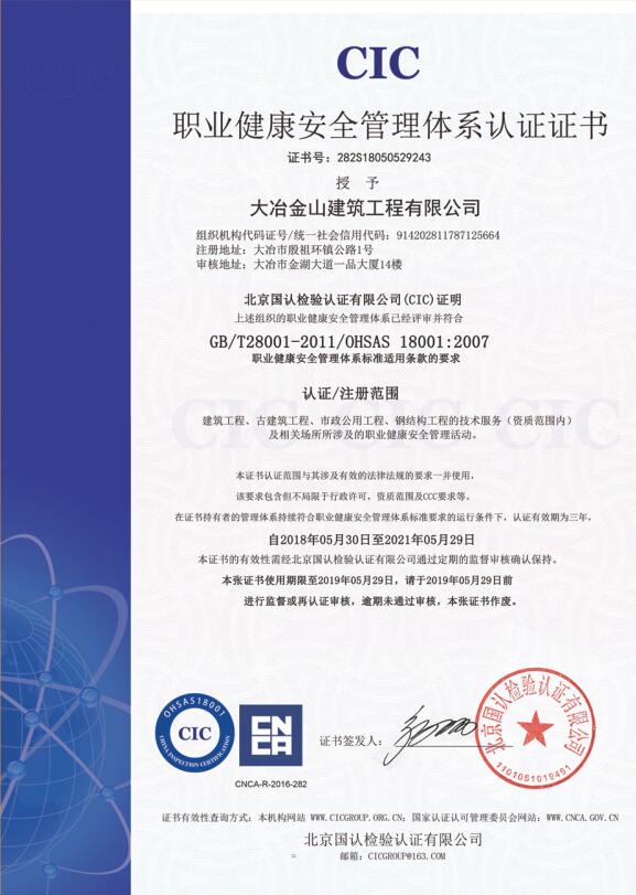 大冶金山建筑工程有限公司始建于1984年,屬鎮辦集體企業。1997年改制為大冶山建筑工程有限責任公司,屬股份制企業。2013年更名為大冶金山建筑工程有限公司,2018年3月公司資源重組,公司注冊資金達到10180.00萬元,公司法定代表人為劉瑞華。公司具有古建筑工程專業承包壹級、建筑工程施工總承包貳級、市政工程總承包叁級、鋼結構工程專業承包叁級資質。